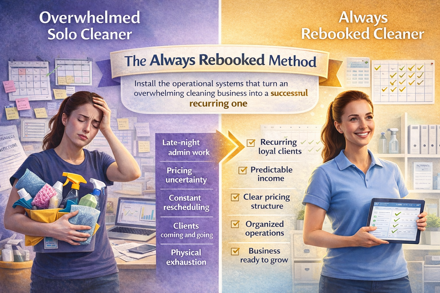 Always Rebooked™ is a systems-based membership for residential solo cleaners who want predictable income, organized operations, and clients that actually stay.