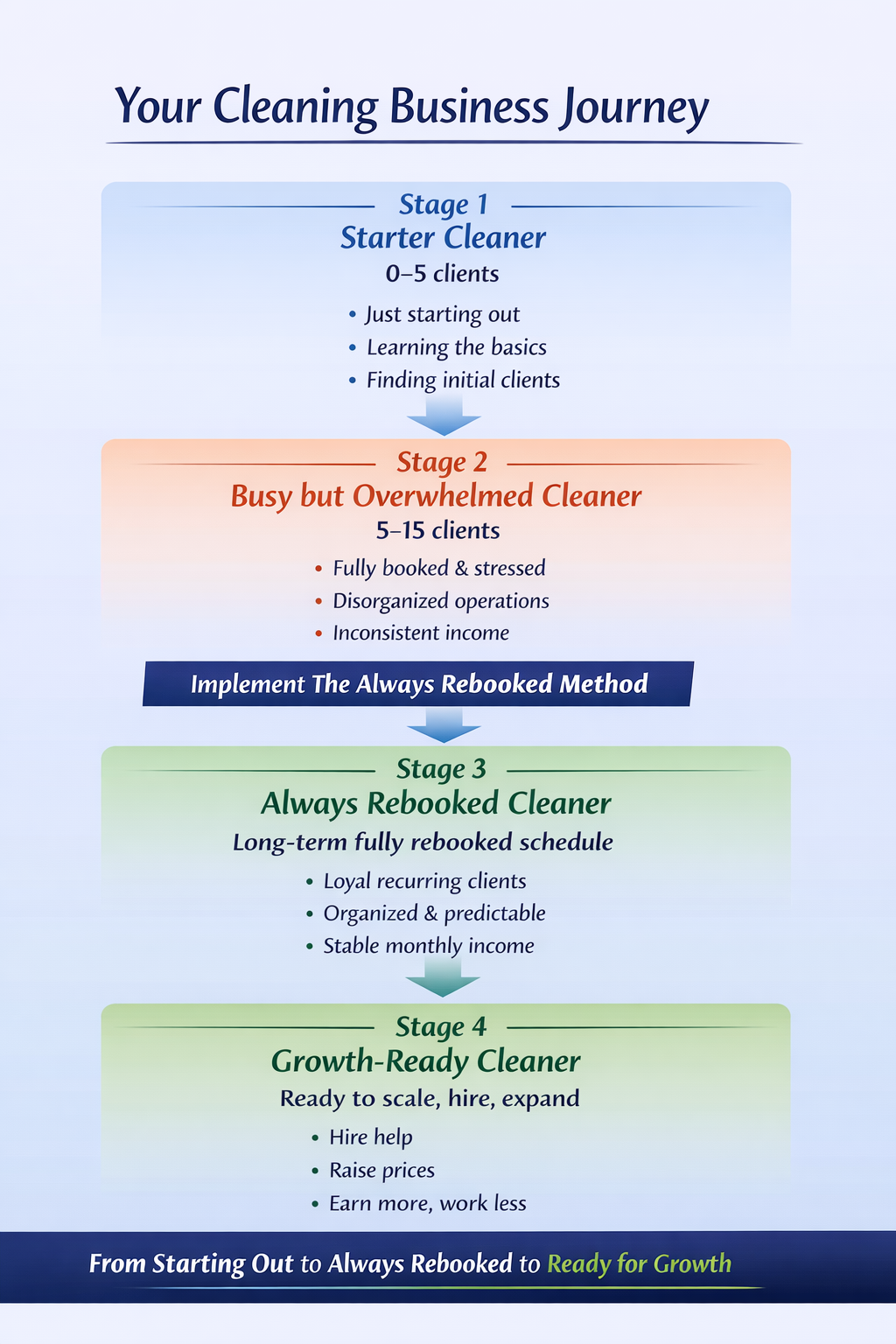 But as the business grows, it moves through predictable stages — from overwhelmed to organized and ready for growth.Understanding your stage is the first step toward building a stable cleaning business.